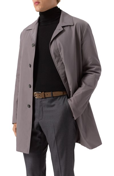 Коричневый ремень с двумя тренчиками изготовили из бархатистой замши. Ею же частично обтянули серебристую пряжку с палладиевым покрытием. На зауженном конце аксессуара вышили логотип бренда с фирменной алой точкой над буквой i.