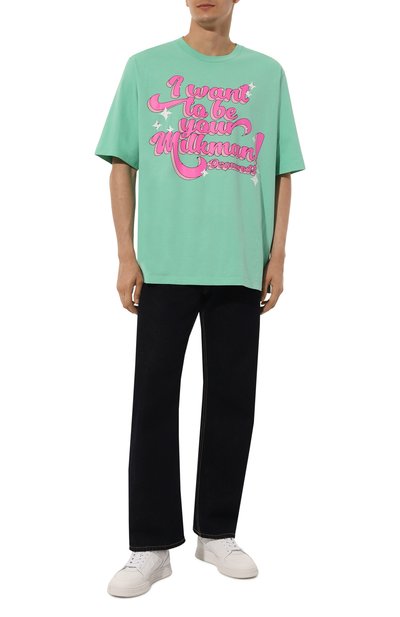 Свободную футболку сшили из хлопкового джерси. Модель украсили зеленым принтом, вдохновленным майоликой Кальтаджироне, по всей поверхности. Круглый вырез дополнили отделкой из мягкого трикотажа. Изделие станет ярким акцентом комфортного образа с шортами и кедами.