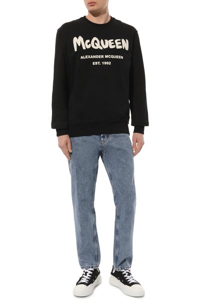 Черный свитшот украсили контрастным флокированным принтом с логотипом и монограммой DG спереди и мотивом, напоминающим фирменную этикетку, сбоку. Для пошива прямой модели использовали мягкий хлопковый трикотаж.