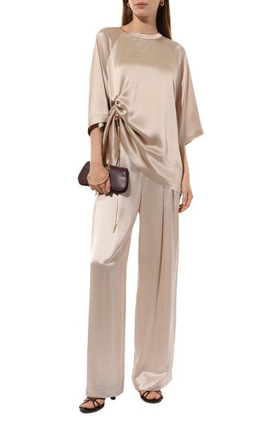 Блуза с абстрактным принтом с синей гамме легко подружится и с юбкой, и с брюками. Для пошива модели с рукавами 3/4, круглым вырезом и пуговицей сзади использовали легкий немнущийся креп из тонкого полиэстера.