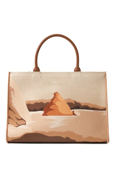Для изготовления сумки с кожаными двумя короткими ручками и регулируемым плечевым ремнем использовали текстиль с жаккардовым узором, изображающим скалы Портоново. Аксессуар с вышитым логотипом спереди дополнили внутренним карманом. В комплекте — брелок с зеркалом.
