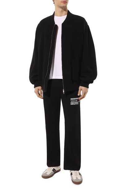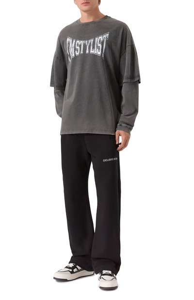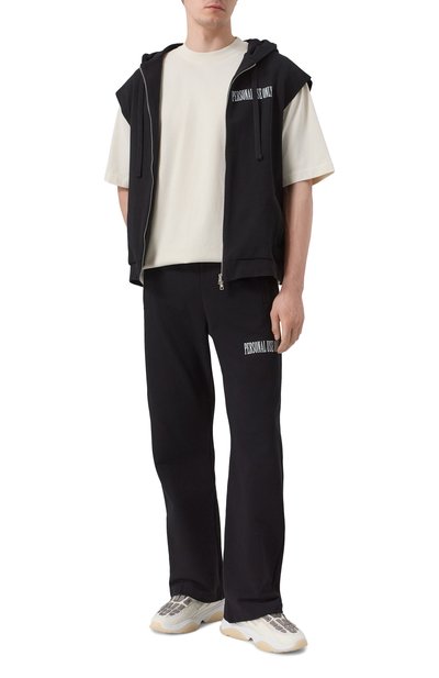 Брюки из хлопкового трикотажа дополнены эластичным поясом-кулиской. Сзади и по бокам предусмотрены прорезные карманы. На левой брючине — будто бы стершийся от времени логотип.