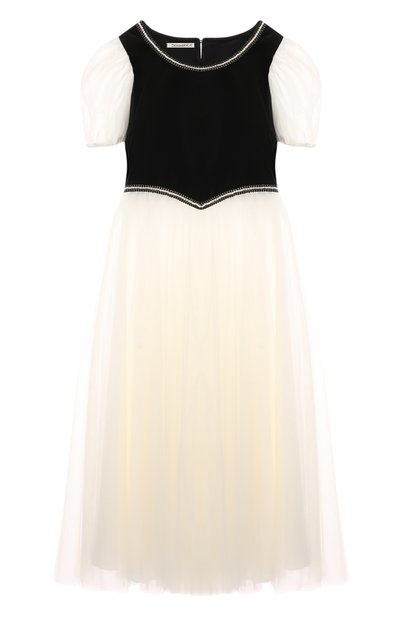 Платье с контрастным лифом, объемными короткими рукавами и расклешенным подолом выполнили из полиамида с добавлением хлопка. Фигурную линию талии и круглый вырез подчеркнули перламутровыми бусинами. Модель застегивается на пуговицы сзади.