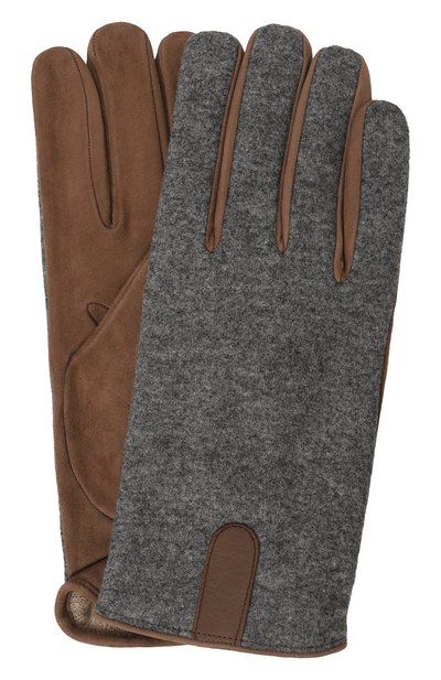Перчатки из коричневой замши и серого шерстяного трикотажа внутри отделаны кашемиром. Небольшая эластичная вставка гарантирует оптимальную посадку на запястье. Единственный декор – узкая кожаная накладка.