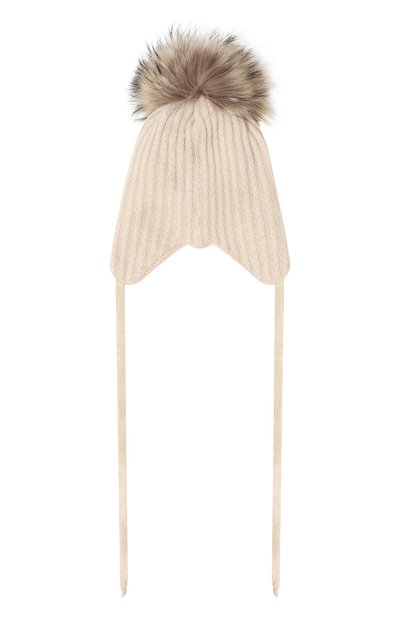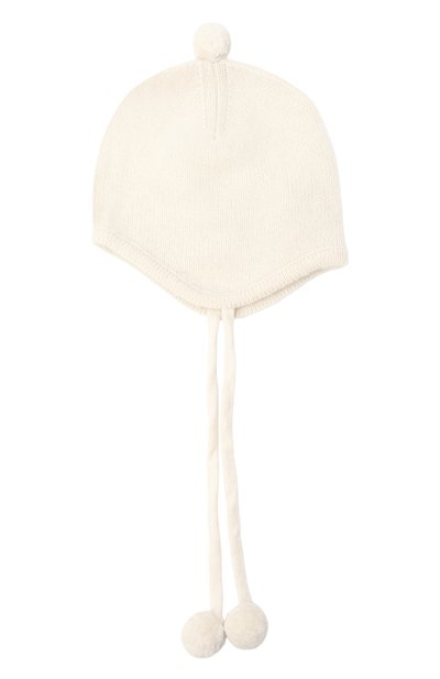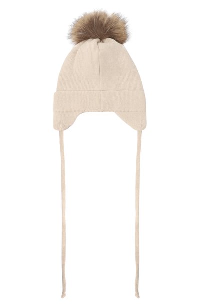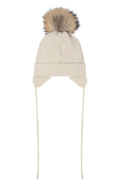 Шерстяная шапка особенно хорошо защищает уши от ветра благодаря наушникам с хлопковым подкладом и завязкам. Аксессуар кремового оттенка украсили двумя крупными меховыми помпонами в тон.