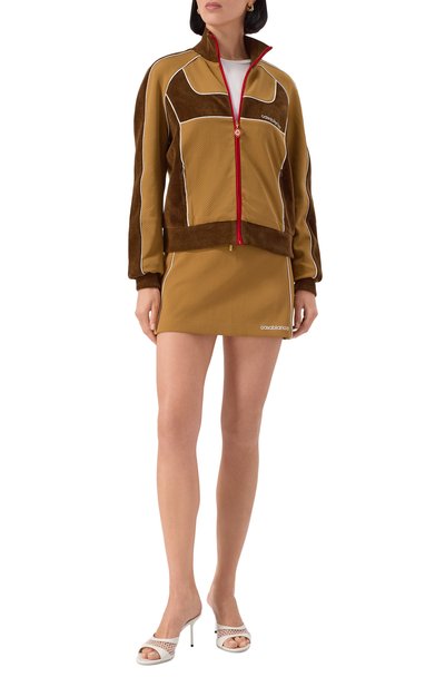 Толстовку с высоким воротником выполнили из полиэстера. Само изделие, как и два врезных кармана, застегивается молнией. Спереди модель дополнили небольшой эмблемой бренда. Предлагаем сочетать с парными брюками и белыми кедами.