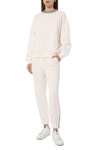 Джоггеры с парой боковых карманов и регулируемым поясом-кулиской выполнили из стрейчевого хлопка. Модель дополнили двумя карманами карго, клапаны которых застегиваются молниями, украшенными кантом из цепочки мониль.