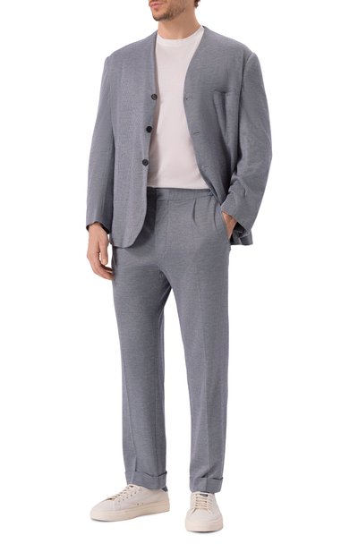 Костюм в меловую полоску сшили изо льна. Пиджак с прямоугольными лацканами дополнили четырьмя внешними и двумя внутренними карманами и держателем для ручки. Еще четыре кармана предусмотрели у брюк с защипами и стрелками.