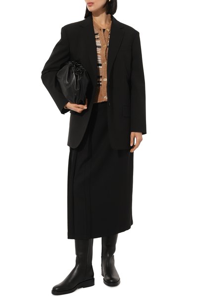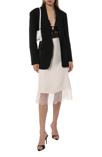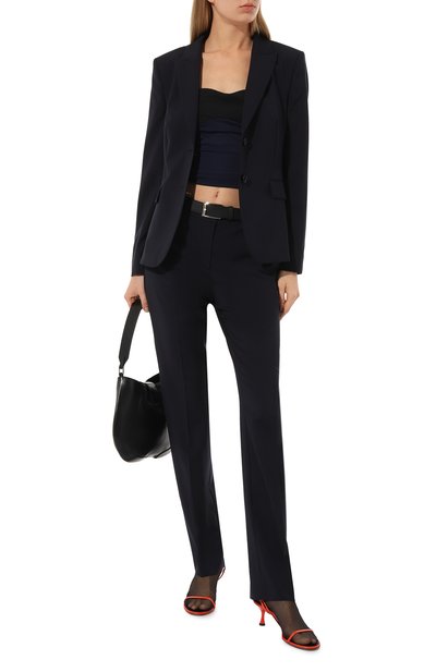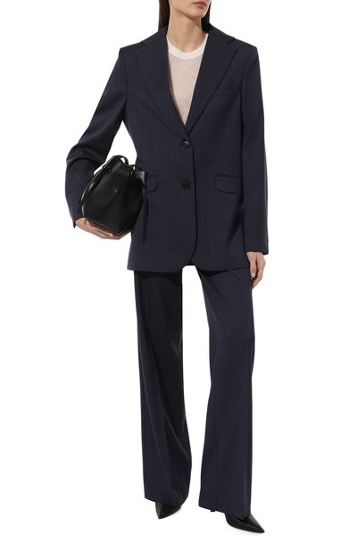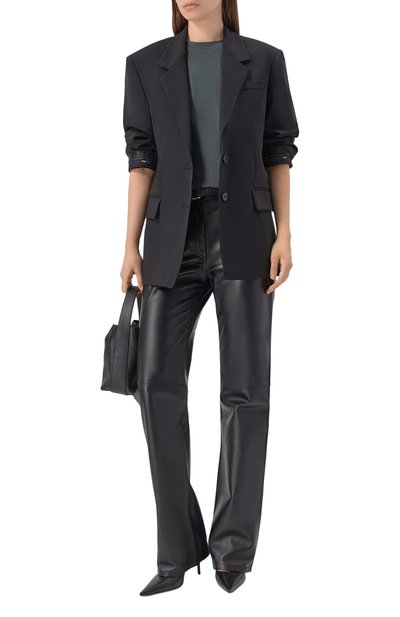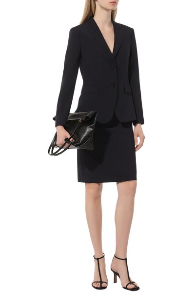 Удлиненный жакет с четкой линией плеч и заостренными лацканами сшили из костюмной ткани с добавлением вискозы. Модель с широкими лацканами и тремя карманами предлагаем сочетать с водолазкой, парными брюками и туфлями на шпильке.