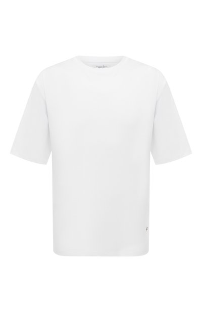 Единственный декор футболки со слегка спущенной линией плеч — фирменный триколор и октагон с головой орла в центре, выполненный из оцинкованного драгоценного металла, снизу. Хлопковую модель наши стилисты предлагают носить с брюками, курткой и кедами.