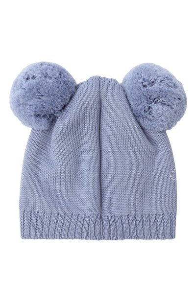 Шапку бини с пушистым помпоном украсили стразами, серебристыми звездами и фирменной подвеской-сердцем с логотипом. Модель с фактурной манжетой связали из мягкой шерстяной пряжи, поэтому она не колется и хорошо согревает.