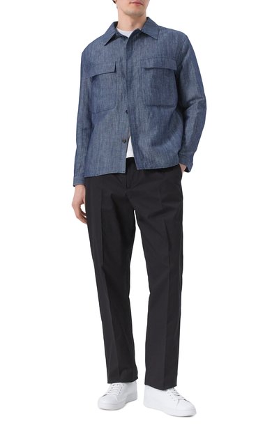 Джинсовую рубашку силуэта oversize выбелили, придав вид выгоревшей на солнце одежды. Модель из чистого хлопка дополнили накладными карманами, один из которых украсили кожаным брендированным патчем.