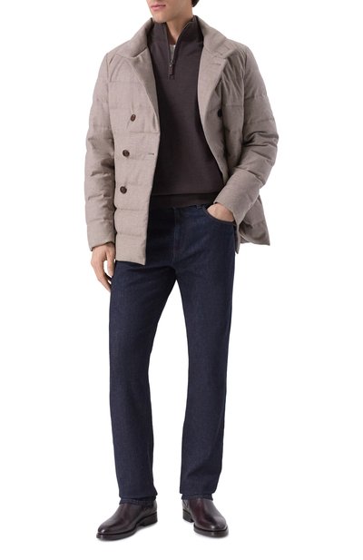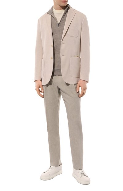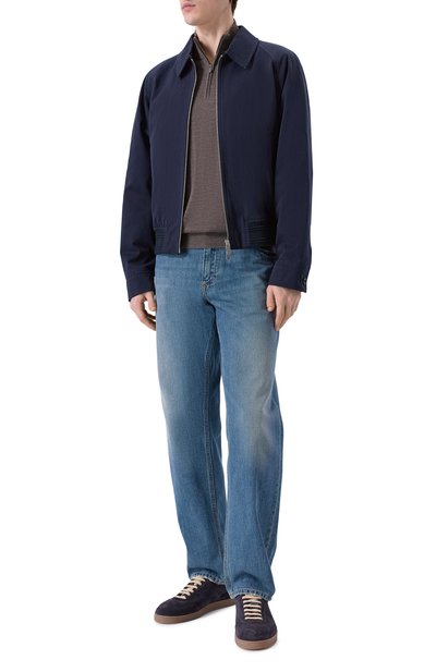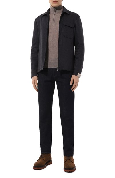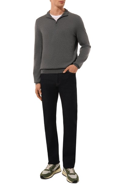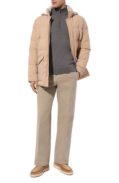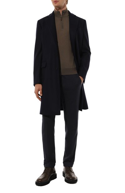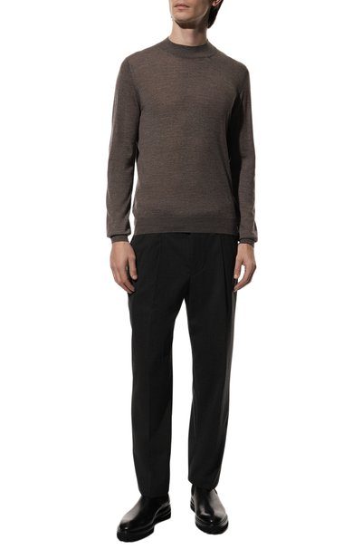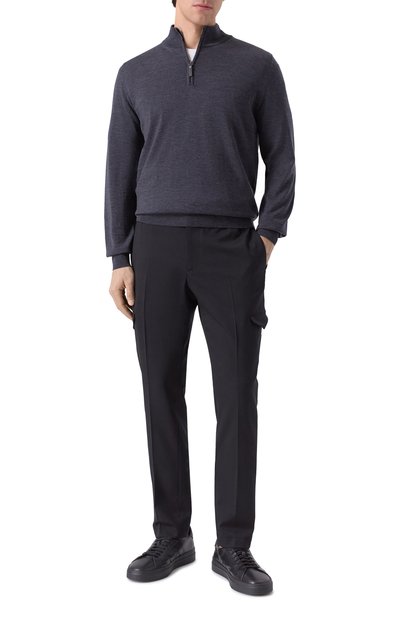 Для создания джемпера использовали шерсть с добавлением кашемира. Высокий ворот, застегивающийся молнией, манжеты и пояс модели выполнили в рубчик.