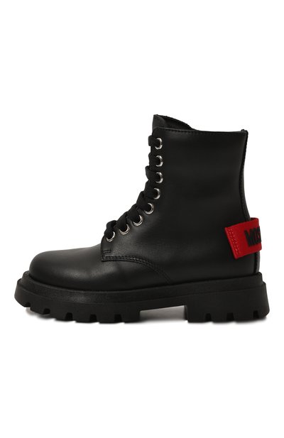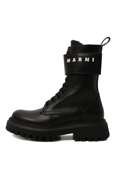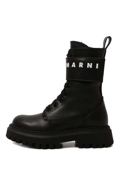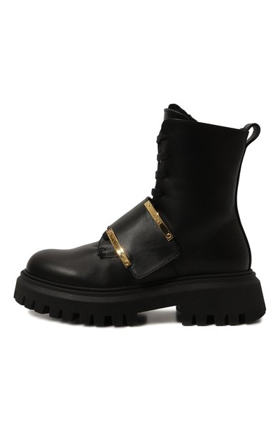 Высокие ботинки из фактурной кожи поставили на широкую подошву с глубоким протектором. Модель с петлей на заднике, боковой молнией и двумя регулируемым ремешками на голенище украсили сзади контрастным вертикальным логотипом.