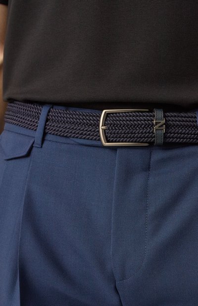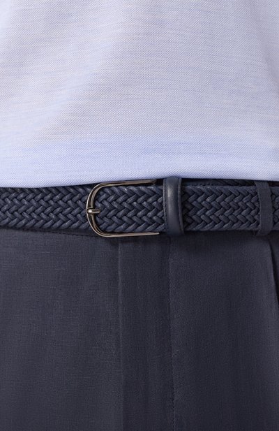 Регулируемый ремень сплели из узких полос глянцевой кожи, что позволяет изделию обойтись без дополнительных прорезей. Из такого же материала выполнили накладки на концах, одну из которых украсили тисненой эмблемой. Аксессуар застегивается прямоугол ьной пряжкой из серебристого металла.