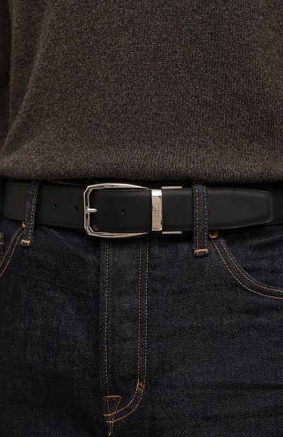 Ремень стандартной ширины можно носить наружу любой из двух сторон. Аксессуар из тисненой кожи застегивается тонкой прямоугольной пряжкой с выгравированным логотипом на интегрированном в нее тренчике.