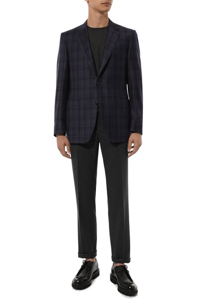 Полуприталенный клетчатый пиджак из тонкой костюмной шерсти сшили по клеевой технологии Half canvas. Модель с широкими лацканами и шлицами сзади дополнили тремя внешними карманами, парой внутренних и держателем для ручки.