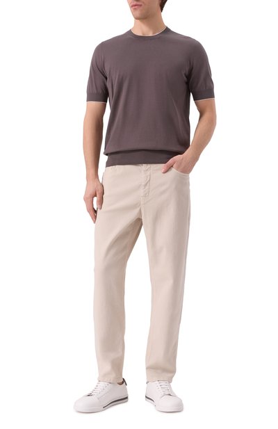 Джемпер выполнили из трикотажа плотностью 18 петель на дюйм, связанного из шерсти первого пострига 120's. Меланжевое изделие дополнили эластичными манжетами и поясом.