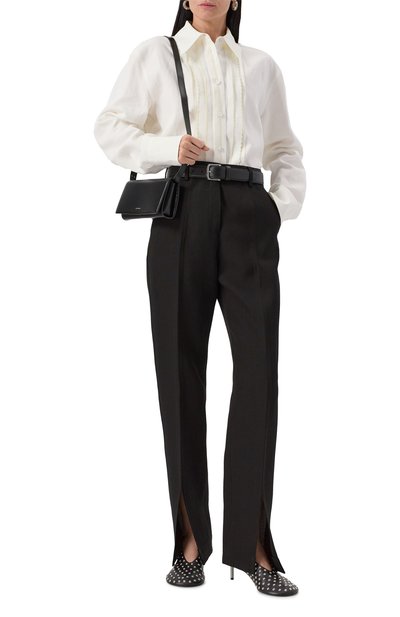 Черные брюки со стрелками будут уместно смотреться в образе любой степени формальности. Для пошива модели с двумя боковыми и парой задних прорезных карманов использовали ткань из вискозы и шелка.