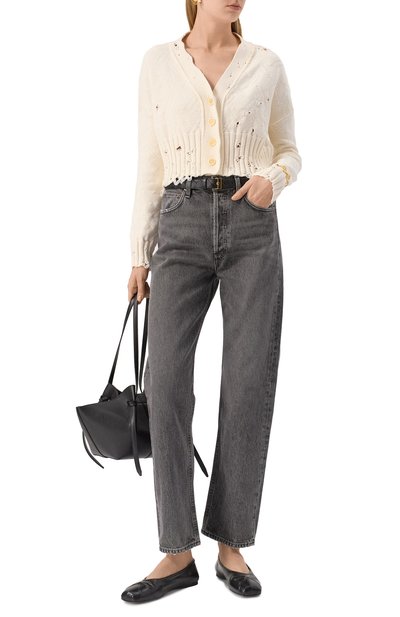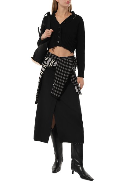 Укороченный кардиган из ребристого трикотажа на основе шерсти и кашемира станет органичным дополнением образа и с юбкой, и с джинсами. Модель с V-образным вырезом и контрастным логотипом марки спереди застегивается пуговицами, украшенными кристаллами.