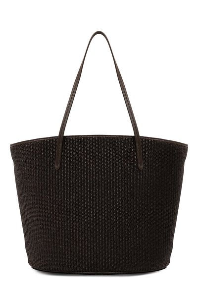 Сумку-тоут сплели из вощеных хлопковых шнуров, напоминающих рафию. Аксессуар с узкими кантом и двумя ручками из прочной кожи декорировали миниатюрными петлями, расшитыми фирменными цепочками мониль. Внутри предусмотрели карман на молнии.