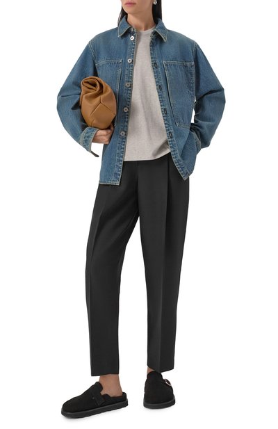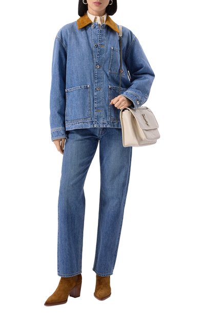 Для пошива свободной куртки с эластичной вставкой по низу и двумя накладными карманами с клапанами использовали японский деним Dark Polished. Модель с узнаваемыми цепочками мониль на погонах застегиваются кнопками с роговыми кабошонами.