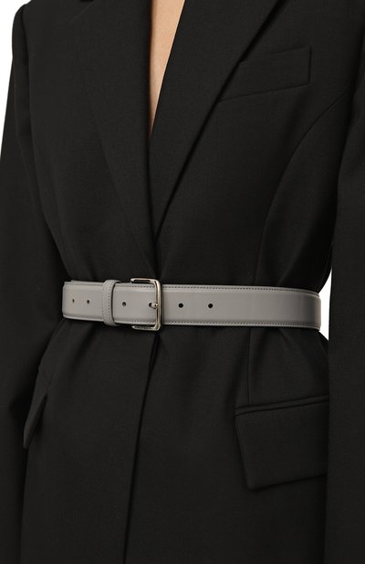 Ремень с тренчиком в тон выполнили из гладкой кожи. Аксессуар застегивается лаконичной квадратной пряжкой с выгравированным логотипом, изготовленной из серебристого металла.