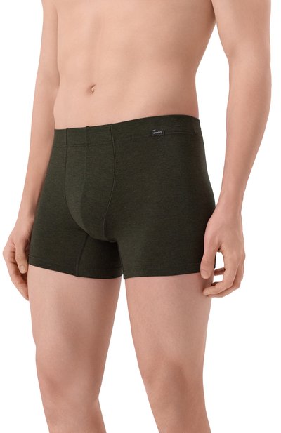 Облегающие меланжевые боксеры изготовили из эластичного трикотажа на основе модала. Для его производства использовали целлюлозу из древесины управляемых лесов. Трусы дополнили широким поясом с логотипом марки.