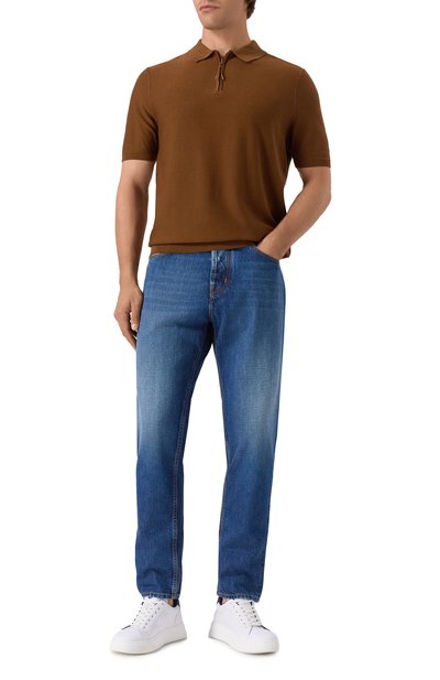 Для пошива поло Parris прямого кроя использовали гладкий трикотаж из мерсеризованного хлопка. Спереди модель декорировали круглым кожаным патчем с серебристой монограммой Double B.