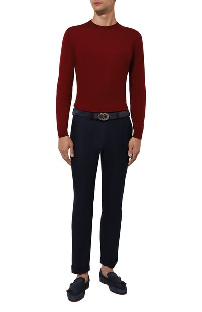 Джемпер с узким кантом на рифленом поясе связали из мериносовой шерсти. Чтобы модель с высоким воротом было легче надевать и снимать, предусмотрели короткую потайную молнию спереди.