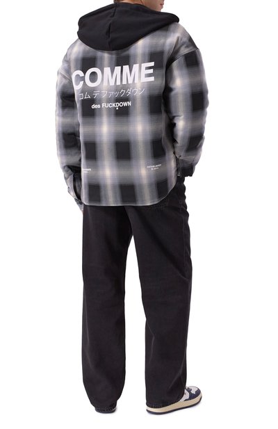 Свободную куртку-рубашку с потертостями и необработанными краями сшили из хлопка в клетку. Модель с объемным капюшоном дополнили нагрудным накладным карманом с вышитой эмблемой бренда, а сзади изделие украсили крупным логотипом.