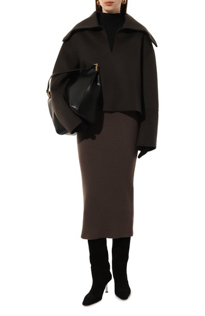 Облегающую юбку-карандаш выполнили из трикотажа на базе шерсти, кашемира и шелка. Лаконичная модель с эластичным поясом станет основой повседневного образа, например, с водолазкой и кардиганом схожей гаммы.