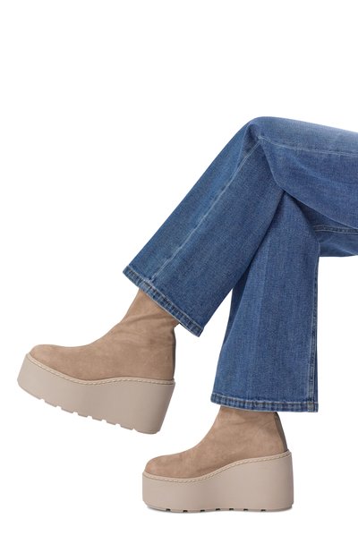Силуэт замшевых ботильонов Arlene с заостренным мысом и скошенным каблуком подчеркнули отрезными деталями. По бокам предусмотрели эластичные текстильные вставки, на голенище спереди и сзади — петли.