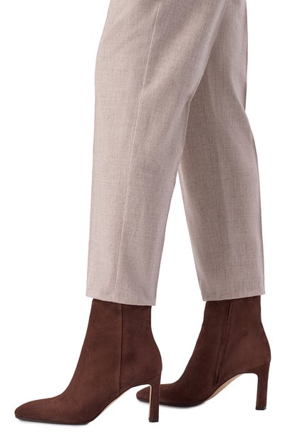 Ботильоны со смещенным изогнутым каблуком выполнили из замши. Модель с узким голенищем застегивается сбоку молнией в тон. Пару можно сочетать как с джинсами, так и с платьем или юбкой.