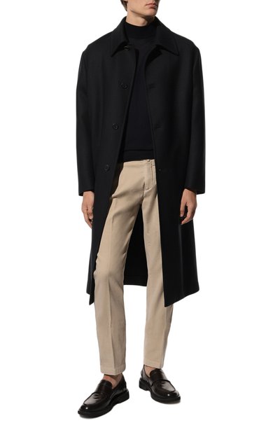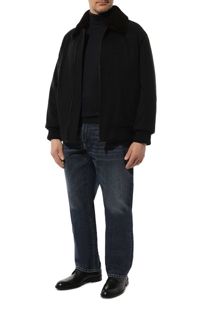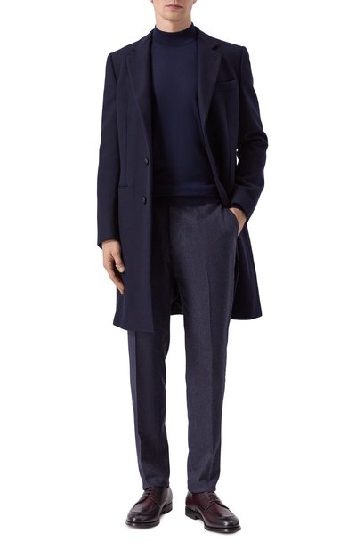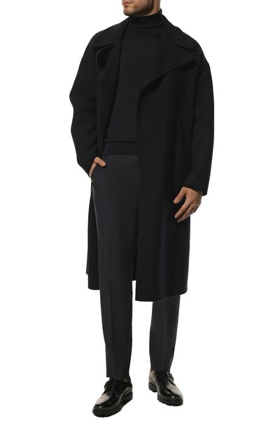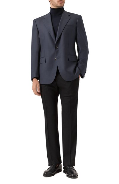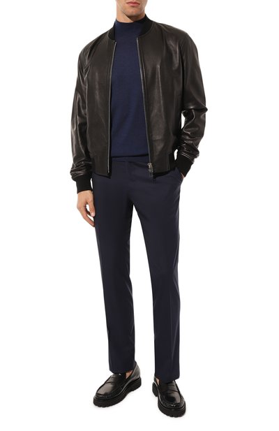 Тонкая водолазка без декора впишется и в офисный образ с костюмными брюками, и в повседневный аутфит с джинсами. Облегающую модель выполнили из чистой шерсти. Высокий ворот, пояс и манжеты связали резинкой.