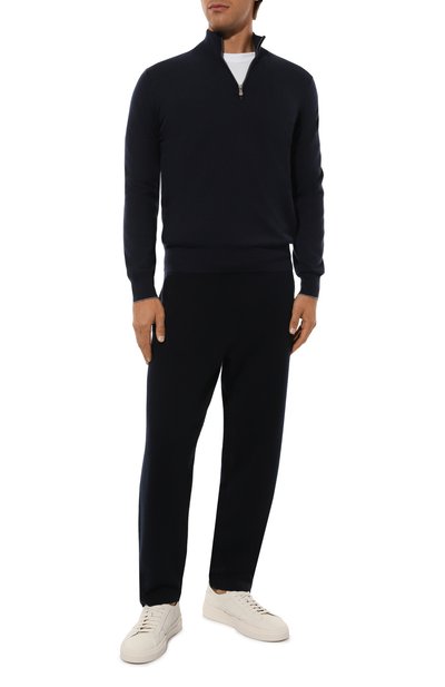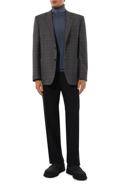 Шерстяные брюки в едва заметную клетку допо лнили эластичным широким поясом, боковыми и прорезными задними карманами. Модель с защипами спереди и отглаженными стрелками гармонично впишется в повседневный образ с футболкой и рубашкой.