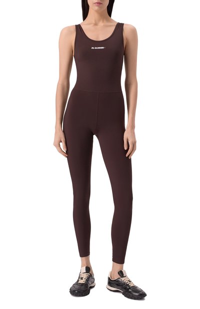 Для создания облегающего комбинезона использовали гладкий трикотаж на основе нейлона и эластана. Спереди модель из линии Jil Sander+ украсили контрастным логотипом.