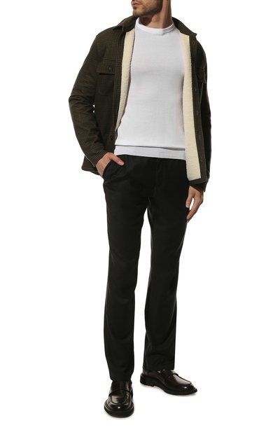 Свободные брюки с манжетами и регулируемым поясом-кулиской выполнили из плотного шерстяного трикотажа, смягченного кашемиром и усиленного шелком. Модель с боковыми карманами украсили сзади фирменной миниатюрной накладкой-звездой.