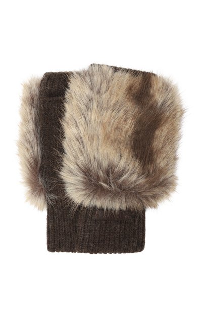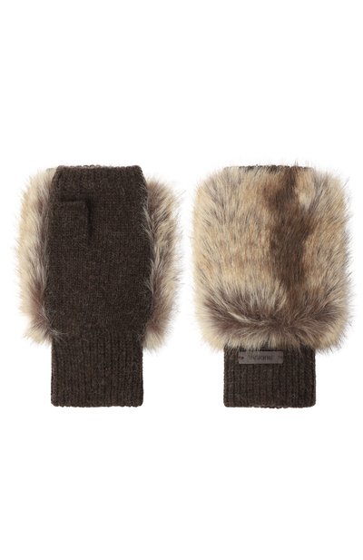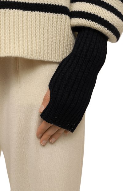 Длинные митенки в фактурную полоску выполнили из шерсти с небольшим добавлением полиэстера. Края деликатно подчеркнули кантом другого цвета и микропайетками. Изделие дополнили деталью в виде фирменной звезды.