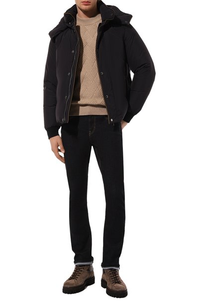 Для пошива лаконичного пуховика, застегивающегося встречной молнией, использовали непродуваемый текстиль из переработанного полиэстера, отталкивающий капли влаги. Куртку с объемным капюшоном, двумя внешними прорезными и парой внутренних накладных карманов утеплили утиным пухом.