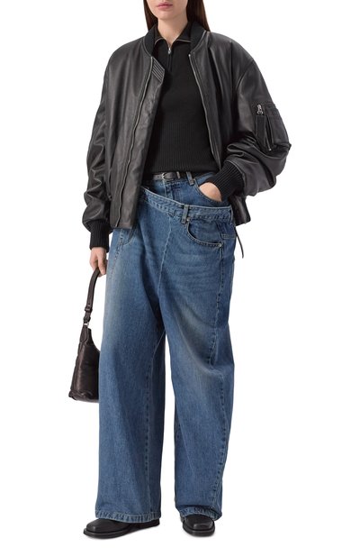 Широкие джинсы с высокой посадкой наши стилисты предлагают носить с футболкой и кедами. Для пошива модели с защипами, двумя боковыми и парой задних накладных карманов использовали выбеленный деним.