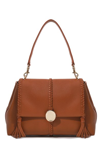 Сумку Penelope со взаимозаменяемыми ручкой и плечевым ремнем сшили из фактурной телячьей кожи. Аксессуар с внутренним карманом на молнии закрывается клапаном с фирменной пряжкой и рельефным плетеным кантом с кисточками.