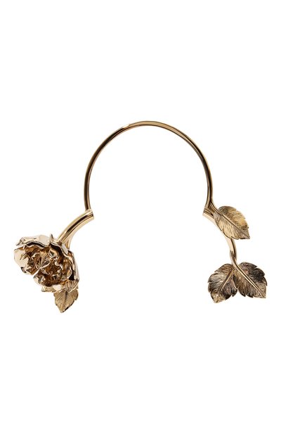 Несомкнутое колье выполнили в виде ветви с объемным розовым бутоном на одном конце и листьями – на другом. Жесткий аксессуар изготовили из отполированной латуни с гальваническим покрытием золотом.