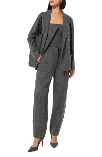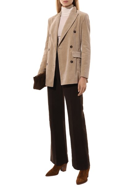 Полуприталенный двубортный жакет изготовили из фактурного материала на основе шерсти и вискозы. Широкие прямоугольные лацканы зарифмовали с двумя клапанами спереди. Предлагаем сочетать модель с парной юбкой и белыми туфлями.