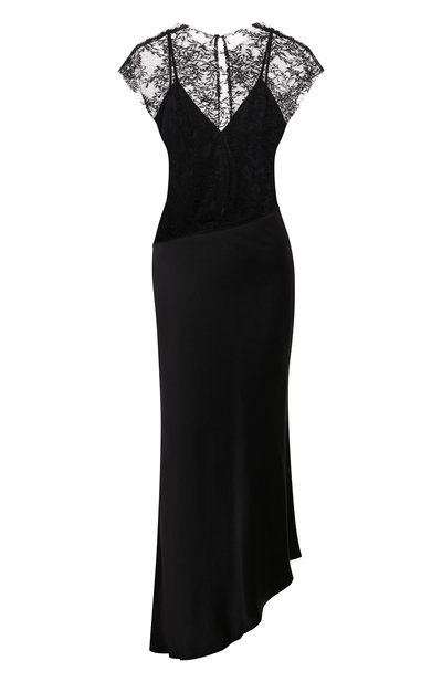 Лиф облегающего шелкового платья-комбинации украсили ажурным кружевом. Сзади предусмотрели потайную молнию и каплевидный вырез с застежкой на пуговицу. Модель с асимметричным подолом станет основой для элегантного вечернего образа.