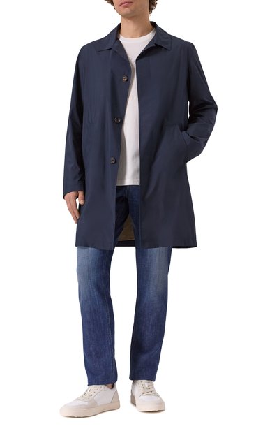 Прямой плащ со скрытыми под планкой пуговицами, боковыми и внутренним карманами сшили из непромокаемого быстросохнущего материала, защищающего от ветра. Длина до середины бедра позволяет носить модель и с повседневной одеждой, и с формальным костюмом.