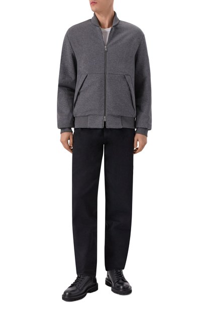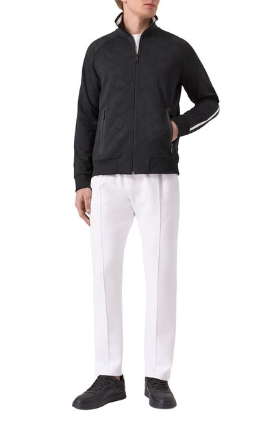 Толстовку с воротником-стойкой изготовили из плотного хлопкового трикотажа. Модель с двумя крупными накладными карманами по бокам, один из которых украсили логотипом бренда, застегивается встречной молнией.