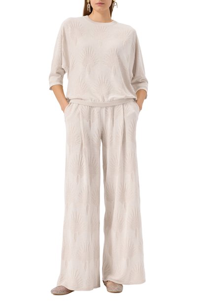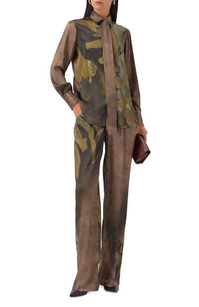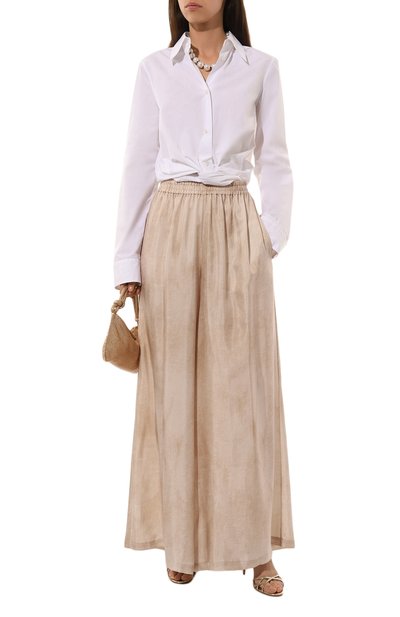 Укороченные брюки с поясом-кулиской выполнили из микса вискозы и купро. Модель окрасили так, чтобы сформировать эффект выгоревшего со временем изделия. Верхнюю часть акцентировали принтом, напоминающим мазки краски.