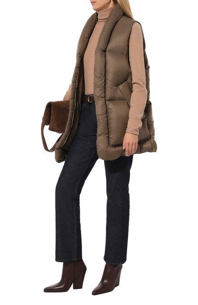 Для пошива дутого стеганого жилета с двумя карманами и шалевым воротником использовали гладкий легкий нейлон. Удлиненная модель утеплена гусиным пухом с добавлением пера. Изделие застегивается потайными кнопками.