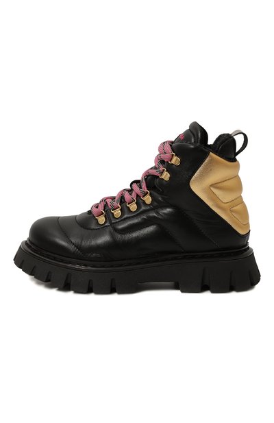 Ботинки из матовой кожи декорировали контрастной стеганой вставкой из такого же металлизированного материала. Модель с усиленной шнуровкой, как у хайкеров, утеплили шерстяным флисом. Массивную подошву дополнили устойчивым протектором.